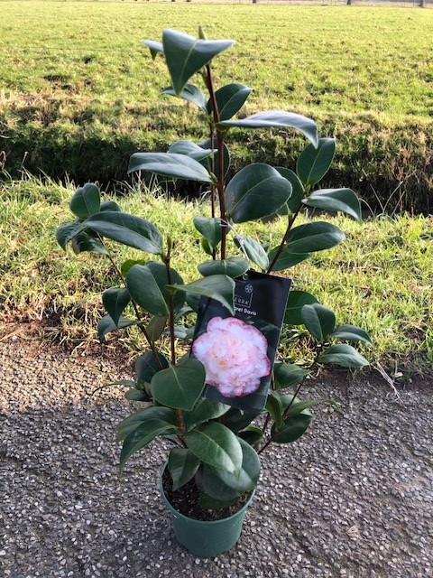 Een soort met mooie grote gevulde bloemen. De bloemkleur is wit met een roze rand. Staat graag op een beschutte plek, niet in de oostenwind.