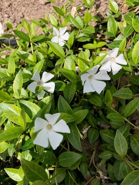 Vinca alba (witte maagdenpalm) is een laagblijvende, groenblijvende bodembedekker met glanzende, groene bladeren en witte bloemen. De plant bloeit vooral in het voorjaar en wordt vaak gebruikt in tuinen om snel de grond te bedekken, ook op lichte schaduw plekken.