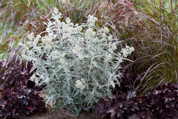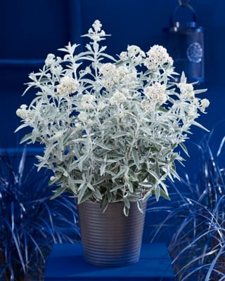 Buddleja Silver Anniversary is een compacte, sierlijke vlinderstruik met opvallend zilverkleurig-grijs blad en witte, heerlijk geurende bloemen. Hoe meer zon de plant krijgt, hoe meer bloemen en vlinders. In het voorjaar terug knippen tot 30 cm boven de grond.